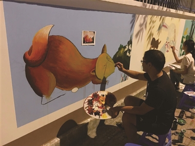 近日,浦江县职业技术学校2016级工美5班学生在教师带领下来到浦阳第一小学,对其墙壁进行美化。充满童趣的墙绘,不仅展示了职校学生精湛的专业技能,更有效提升了小学生的艺术修养和审美情趣。 (本报通讯员 童添添 摄)