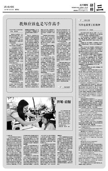 很多人评价我:是个作家教师,文章写得好,学生作文也指导得好。我可以在短短9个月里,指导两个初一班级106位学生人人发表作文,总计200多篇,刊登的媒体有《中学生》《中学时代》《中学生天地》《读者》《做人与处世》《课堂内外》《黄金时代》等杂志。