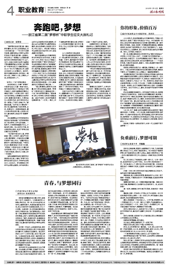 温州市瓯海职业中专集团学校学生朱玮珏在《你的形象,价值百万》一文中,讲述了自己从不顾家人强烈反对选择了“美发与形象设计”专业到受邀成为周杰伦“地表最强”世界巡回演唱会杭州站特邀化妆师的心路历程;慈溪职业高级中学学生钱鑫鑫在《负重前行,梦想可期》一文中,讲述了自己从沉迷电脑游戏到在人才市场上找工作受挫再到励志苦练技能的寻梦之旅;绍兴市上虞区职业中等专业学校学生何佳丽在《我的美味奇缘》一文中,娓娓道来自己和美食的不解之缘……