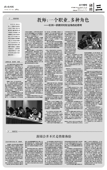 富阳区常安镇中心小学的徐恩更关注教师自身的修为:“教师所做的一切,是为了学生的生命成长。但教师不是农夫山泉搬运工,而是要给学生平台,让他们自己成长,最终教师也在学生的需要、触动和推动下得到成长。”作为一名农村教师,徐恩应对职业倦怠症的方法是,成为一个研究者,经过19年的坚守和突围,4年前,徐恩突然爆发,频频在市、区的小课题立项和科研成果评比中获奖。