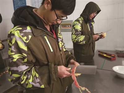 近日,浙江信息工程学校2017级烹饪专业组织了一场妙趣横生的削苹果大赛。不同于用水果刀削苹果,这次学生们要求用菜刀削苹果。比赛要求学生在20分钟内削一个苹果,果皮厚薄均匀、连续不断者为最佳。比赛中,学生们兴趣盎然。不少学生表示,过年回家要给长辈削苹果,这样既能锻炼技能,还能增进和家人的感情。(本报通讯员 施胜胜 摄)