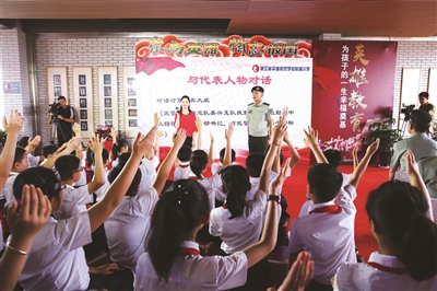 这是一所英雄教育开展了55年的学校。在班主任叶屠英的引导下,学生们认真聆听英雄故事,观看英雄教育短片,集体朗诵《英雄颂》。作为教育部向全国推荐的5所学校之一,当天,该校开展的“崇尚英雄 精忠报国”主题班会公开课还通过中央媒体和部分直播平台,向全国中小学生播放。