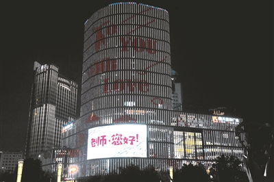 为庆祝第34个教师节,教育部教师工作司、中国教师发展基金会号召全国各地于教师节当晚在当地地标性建筑上为教师“亮灯”,引导社会各界感念师恩、礼敬教师。9月6日晚,杭州武林广场提前试亮灯,LED屏幕滚动播放“老师,您好!”字样。图为试亮灯现场。(本报记者 邵焕荣 摄)