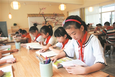 新学期,杭州市富阳区大源镇育才学校的“凌霜傲雪”阅览室正式投入使用。阅览室的设计装修由慈善人士郑蓉捐赠。最近6年,她为富阳12所相对偏远的乡镇小学,各援建了一间有特色的阅览室。图为育才学校的学生在新阅览室里看书。