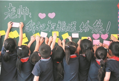 9月5日,遂昌县育才小学学生利用午休时间,在彩色的纸上写下对教师的祝福,并一起贴到黑板上,以此作为送给教师的节日礼物。
