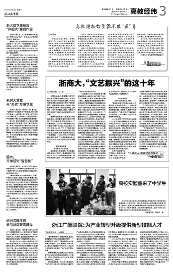 “文艺振兴”以来,学校团委艺术教研室的教师从原来的2名扩充到了5名,不仅开课量大大增加,授课质量也取得了提升。教授经典话剧鉴赏课的教师、校团委艺术教研室副主任沈骁婧告诉记者,学校的艺术类通识课近年来正逐步走出以往单纯鉴赏、缺乏互动与体验的窠臼,力图以深入浅出的方式带学生体验精彩的艺术之旅。比如,她的另一门课剧本创作还根据授课需要,将课堂容量限制在20人,上课时大家围成一圈,确保每名学生都有深入体验的机会。2012年,浙商大出台办法,规定学生必须选修一定学分的艺术类模块课程,鼓励非人文艺术学科学生多接触艺术类课程,保证了艺术教育的覆盖面。如今,教师们还在筹建艺术教育体验中心,以继续增加通识课程的实践性与参与性。