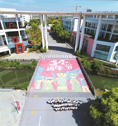 在第100个五四青年节即将到来之际,湖州艺术与设计学校工艺美术专业部70多名学生花费将近4个小时,使用6箱粉笔,创作出了一幅360平方米的超大幅地面粉笔画,献礼五四青年节。
