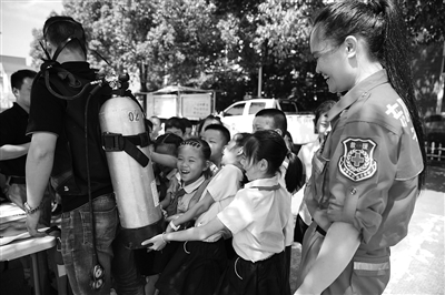 近期全国各地学生溺水事件频发,而暑假又是溺水事件高发期。小学一年级学生对溺水知识普遍不了解,为了使学生度过一个平安的暑假,东阳市江北小学教育集团茗田校区近日开展了“珍爱生命,预防溺水”主题活动。学校邀请了东阳市红十字救援队为一年级学生作专题讲座,讲解溺水时该如何自救和他救。图为学生触摸救援器材。
