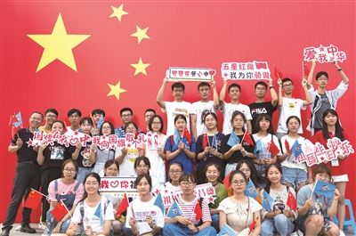 9月8日是浙江中医药大学新生开学报到日。当天,该校开展“我与国旗合张影,我向国旗敬个礼”主题活动,众多师生和家长纷纷与巨幅国旗同框合影,表达对祖国的祝福。图为医学检验技术专业学生和国旗合影。(本报通讯员 彭建华 方 阳 摄)