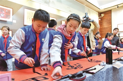 11月29日,由浙江省教育厅教研室附属小学、嵊州市剡山小学等5所浙江省书法教育研究会实验基地学校联合举办的“墨香书韵,以爱为旗”书法作品展在杭州博物馆隆重开幕。图为学生代表正在现场书写“爱”字。