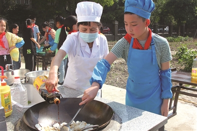 绍兴市秀水小学校园的竹林边有块空地,两年前热心的家长志愿者和学生一起,翻地、做篱笆、树班牌,建设了一个蔬菜基地——沃园。课余时间,经常可以看到学生们在这里浇水、治虫的身影。学生们也会欣喜地发现地里的豌豆发芽了,芹菜、青菜、蒿菜长势喜人……图为近日,在沃园边的大土灶台上,六(1)班学生徐正灏和同学们在食堂阿姨的指导下,用自己种的青菜炒年糕。(本报通讯员 胡建成 摄)