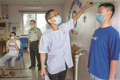 7月9日参加完高考全部科目的考试后,家住衢州市柯城区华墅乡的高三学生朱佳豪便和同学一起来到乡卫生院,参加2020年夏季征兵体检。据悉,此次征兵体检为初检,初检合格后还有体格检查、政治考核和役前训练等环节。图为体检场景。