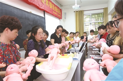 近日,安吉县社区教育学院孝丰分院举行了第二期中级育婴员培训,全镇各社区学员参加,由“阿姨来了”月嫂中心指导教师授课。从婴儿的视觉、触觉等认知能力训练,到抬头、侧翻等动作能力训练,再到对婴儿的微笑、语言等反应进行逗引的训练,教学内容丰富多样,帮助学员们辨别和掌握各种日常细节。图为指导教师黄英为学员们示范如何给婴儿洗澡。