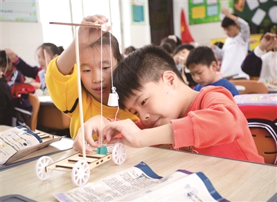 近日,温岭市箬横镇中心小学参与了当地流动少年宫带来的20多个科技体验项目,如对战机器人、虚拟画线、电力闯关等。图为该校学生正在完成重力小车手工制作。