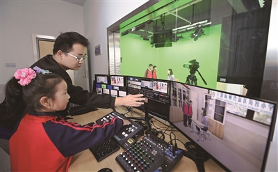 宁波杭州湾新区海智小学的校园电视台日前正式投入使用。学校配备了绿幕、录制系统、直播平台等设备,还让孩子们学习编导、表演、采访、拍摄、剪辑、放映等技能,以培养媒介素养。图为师生们在拍摄垃圾分类情景剧。