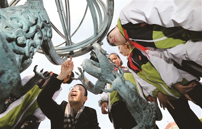 日前,嘉兴市光明小学在校园内建成了一座浑仪,让孩子们近距离感受中国古代科学家的聪明才智。图为学校科学教师钱嘉彧正在给学生们讲解浑仪的使用方法。(本报通讯员 祝慧华 摄)