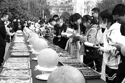 近日,浙江农林大学举行后勤文化节餐饮岗位技能大赛。该校各食堂的近百名厨师和员工,在校园里现场烧制了近千道美食供全校师生免费试吃、品尝。各食堂将根据师生品尝和评选的结果,陆续推出受师生欢迎的好菜品。图为评选现场。 (本报通讯员 陈胜伟 王莉波 摄)