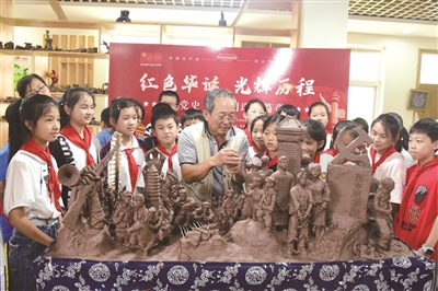 最近,建德市明珠小学校外辅导员余一夫经过两个多月,创作完成了一件长180厘米,宽80厘米的巨型党史题材陶艺作品。他在陶艺课上,向五(3)班学生们一边讲述自己创作陶艺作品的心得体会,一边对作品进行最后的精修,让更多学生从中知史爱党。