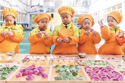 12月20日,长兴县洪桥镇中心幼儿园开展“多彩饺子暖冬至”主题民俗活动。小朋友们在教师的指导下,用蔬果汁制作成菠菜绿、南瓜黄、火龙果紫等面团,共同包饺子,迎接冬至的到来。