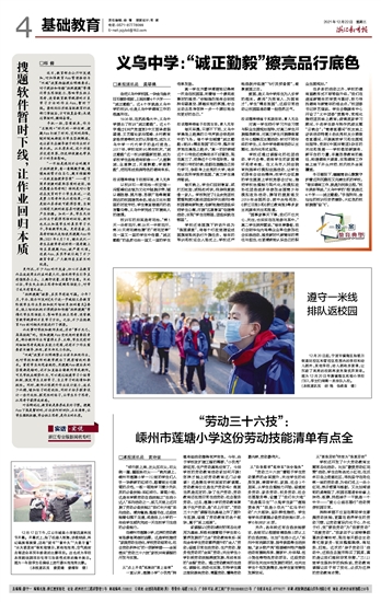 冬日暖阳下,巍巍青岩山默默守护着这所沉稳而又充满生机的学校。“做实德育工作,就是为民族立根。”校长吴彩军说,“义乌中学的‘根’就是这4个字——诚正勤毅。”手指所向,金灿灿的校训石安然横卧,火红色的校标展翅“奋飞”。