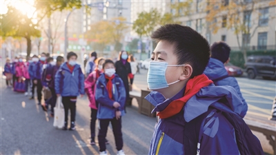 12月20日起,宁波市镇海区除蛟川街道封控区和管控区范围内的学校和幼儿园外,其他学校、幼儿园有序复课,让沉寂了两周的校园再度充满欢声笑语。图为12月20日早晨镇海区实验小学校门口,学生们间隔一米排队入校。