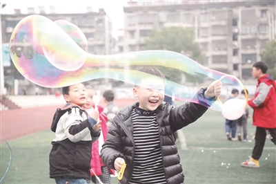 12月17日下午,江山市城南小学第四届科技节开幕。开幕式上,除了机器人街舞、诗歌朗诵、科幻画展等展演,还有“拔书”“掌中火”“大象牙膏”“水火箭发射”等实验演示,更有泡泡秀、空气炮射击等适合不同年龄段的比赛项目。这也成为学校本学期社团项目化学习阶段性成果的集中展示。图为一年级学生在操场上进行最长泡泡秀比赛。