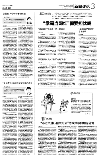 这让我想起多年前的一次听课活动情景,一位国内知名特级教师在上小学语文阅读课时,不时用“嗯,你真聪明!”“嗯,你还要聪明!”的话语在夸奖刚回答完问题的学生,这让在下面观课的我心里咯噔了一下——如此用比较级的方式对班上学生的先天智商进行评价,是否会给学生带来负面影响?在不断的比较中,让弱者自卑,使强者自傲。久而久之,会导致学生心浮气躁或缺乏自信。问题在于,这样的一种对孩子先天禀赋无厘头的“赏识”情况在现实中过于普遍,甚至可以说是蔓延于无数的家庭和课堂之中!对于正在成长的少年儿童而言,最糟糕的做法恐怕是“因事论人”,并且往往无所顾忌地强化对其遗传因素的臧否!这对少年儿童的负面影响是隐性而久远的。谷爱凌的成功案例或许能给当下许多教师和家长带来很有说服力的正面教育!