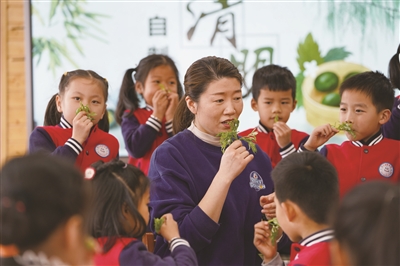 清明节来临之际,诸暨市浣江幼儿园教育集团东湖幼儿园开展了“舌尖上的清明”活动。师生一起制作传统特色食品“清明团”,了解清明节习俗。图为教师带领幼儿们认识制作“清明团”的主要材料——艾草。