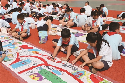 近日,台州市路桥区横街镇中心小学组织学生在百米长卷上绘画,进行网络安全宣传,以防范网络诈骗,增强网络安全意识。
