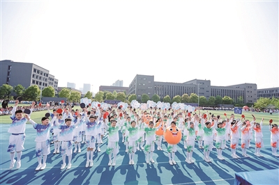 杭州第19届亚运会日益临近,省内各校积极营造全员健身、迎接亚运的氛围。图为杭州市崇文教育集团第三届小海燕运动会开幕式上,学生进行多个运动项目的特色展示。