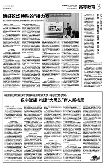 除了思政组教师全体总动员,浙江特教职院还把学生推向讲台,“大学生讲思政课”的视频也常被基层学校用作教学案例,在课堂上播放。“作为一名残疾人,我能为共同富裕做些什么?”“残疾青年就只能等靠要吗?”……在“共同富裕,青年奋斗”思政微课上,浙江特教职院残健两类学生通力合作,不只是通过校园采访搜集了解残疾学生眼中的共同富裕是怎样的,推拿专业学生金光亮还分享了自己的成长故事。在学校党委宣传统战部部长徐聪琴看来,残健融合的思政课通过体系重构、流程再造、能力重塑,既能给中小学生以莫大的激励,对于将来会走上教育或服务残疾人工作岗位的健全学生来说,也能提前了解残疾学生、涵育理解与包容,达到残健融合、协同共培的育人效果。