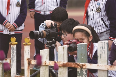 “对焦要对准,角度可以低一点。”“背景拍得干净一点。”近日,在余姚市梨洲小学操场边的花坛内,由学生播种、养护的大片郁金香盛放。摄影社团的学生在教师的指导下,拿着“长枪短炮”对着一株株艳丽的郁金香一阵“猛拍”。