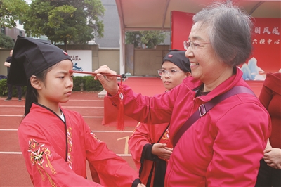 11月14日,舟山市普陀区六横镇中心小学举行十岁学生成长礼活动。家长为学生点朱砂启智,激励学生在成长的道路上不断努力,超越自我。现场还有拜师礼、行孝礼、纸鹤寄情等活动环节。
