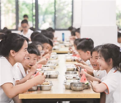 新学期,缙云健全陪餐机制,打造“真陪餐”线上监管功能模块,通过精简陪餐操作流程、以刷脸取餐方式进行线上陪餐登记,实现陪餐人员与学生“同窗打菜、同桌用餐、同付餐费”。图为缙云县实验小学教育集团培仁校区教师陪同学生一起在食堂用餐。