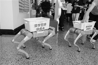 9月13日,浙江机电职业技术大学迎新现场,赛博元素处处可见。图为机器狗背着标注有“同学您好,请喝水”字样的篮子穿梭在人群中,为新生送上矿泉水。