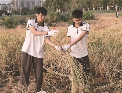 近日,浙江师范大学附属中学举办丰收节活动,以劳动为纽带,串联起德育的责任、智育的实践、美育的创造和体育的坚韧。经过春种、夏耘,学校“东莱稼园”内的16亩稻田迎来丰收。学生们收割水稻、脱粒,并以稻壳、稻穗、稻草为原料创作艺术作品,在收获果实的同时收获成长。图为学生在收割水稻。