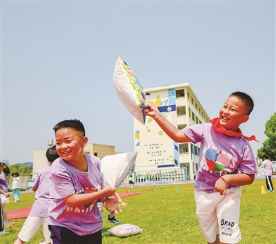 10月15日,浦江县浦阳第五小学在操场上举办了一场“枕头大战”。这场活动并非简单的嬉戏打闹,而是学校精心策划的一次心理健康教育,让学生在充满趣味的集体互动中有效释放压力、宣泄负面情绪。图为学生在抛枕头。