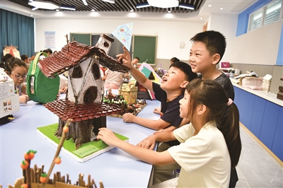 10月16日,建德市明珠小学举办科技节生态建筑获奖作品展示活动。学生们将纸箱、塑料瓶等废旧物品制成建筑模型,通过创意变废为宝。图为获奖作品展示活动现场。