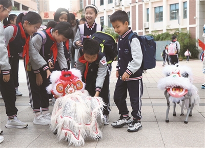 日前,宁波市北仑区岷山学校第十二届科技节开幕。本届科技节以“传承文脉,智创未来”为主题,旨在通过沉浸式体验,让师生在看、玩、做、思中感受科技与传统碰撞的独特魅力。图为学生与机器狗扮演的“小舞狮”互动。