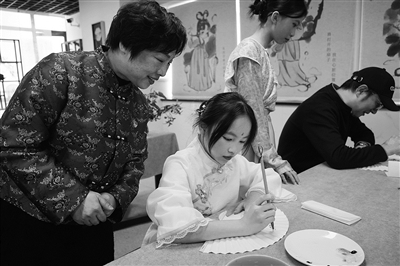 11月5日,杭州市安吉路教育集团新天地实验学校举办安吉路·新天地非遗文化馆开馆仪式。图为国家级非物质文化遗产代表性传承人孙亚青在指导学生手绘扇品。