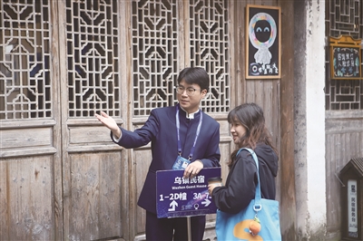 11月6日至9日,2025年世界互联网大会乌镇峰会举行。乌镇峰会期间,共有909名“小梧桐”青年志愿者参与服务。他们来自浙江21所高校,规模为近5年之最。图为来自浙江理工大学的“小梧桐”为来宾提供道路引导服务。