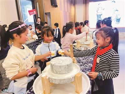 11月6日,安吉县第七小学教育集团银湾校区的学生走进高庄村祖名豆文化研学基地。他们在工作人员的介绍下,了解豆制品文化,并操作石磨研磨豆浆,学习传统工艺。图为学生品尝到自己亲手磨出的豆浆,充满自豪与喜悦。