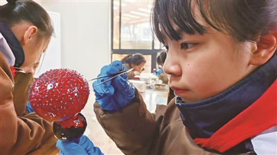 虽不是在校教师,何垂羲却对学校的景观布置如数家珍——他每周二都会准时现身,为选修“济公大漆葫芦”特色劳动课程的学生带去专业指导。