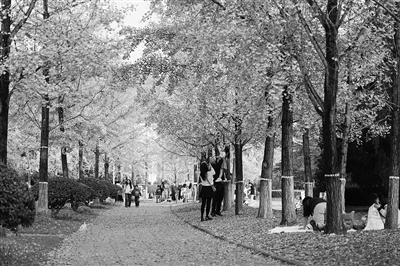 近日,浙江农林大学校园里银杏叶纷纷飘落。从2010年起,学校每到银杏叶黄时,除主干道外,其他区域都相应减少落叶的清扫频次,让师生更好地感受美景。图为铺满银杏叶的校园。