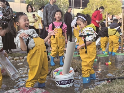 “W·美”课程是杭州市萧山区南江幼儿园的核心教育特色。近日,该园举办大班家长开放日,设置蒸番薯、炒栗子、踩水车、树叶装饰帐篷等活动,让幼儿在最真实、最自然的场景中回归本真状态。图为大班幼儿在溪水海洋球游戏中获胜欢呼。