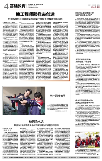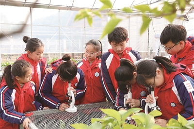 绍兴市越城区沥海街道中心小学本学期新建了一个近300平方米的智慧大棚,还成立了“小浪花农科院”。图为近日,学校五年级“云耕童植”项目化学习小组的成员在智慧大棚里,对培植土壤进行数据监测、比较与记录。