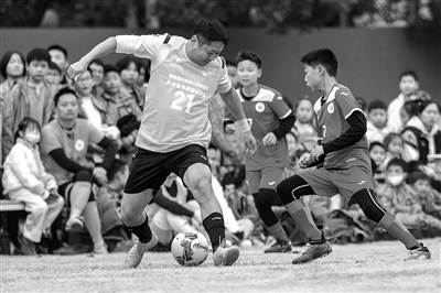 12月10日,长兴县第六小学组织亲子足球比赛。图为家长联队与学生男子甲组队比赛现场。