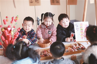 12月15日早晨,天台县坦头镇中心幼儿园的教室里静悄悄的,而教室外却已是一派热火朝天的景象。廊道一隅,小班幼儿的糖葫芦小摊正式“营业”:串水果、裹糖浆、包装、售卖,幼儿们有模有样地开展着“创业”实践。与此同时,“水果加工生产链”也在有条不紊地运转,制作橘子饮料、摆柚子糖小摊、烤制苹果派……教学楼的走廊变成了一个繁忙的集市。