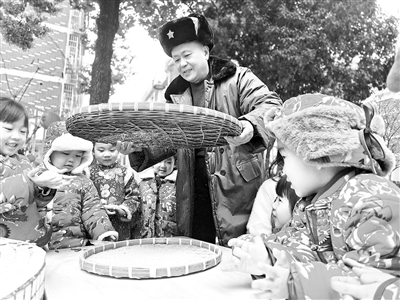 日前,义乌市国贸幼儿园开展了主题为“跟着长辈备年货”活动。幼儿们在长辈的指导下搭灶台、劈柴火,干劲十足,沉浸式体验新年民俗文化。油皮纸裹住焦香四溢的瓜子、花生,麻绳一系,福字一贴,年味便藏进纸包的褶皱里。图为瓜子炒好后,幼儿在长辈的帮助下筛去盐粒。