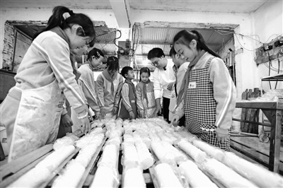1月14日,温岭市大溪镇潘郎小学开展“行走的乡土课——做年糕,品年味”活动,学生走进年糕工坊,参与制作传统美食年糕。图为活动现场。